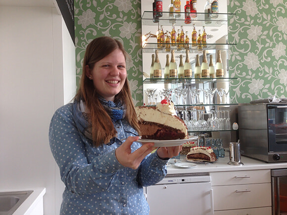 ボリュームは多いが甘すぎないので、キルシュヴァッサーの香りに一口、もう一口とフォークが進む。男性にもファンが多いこのケーキ、ビールを飲みつつケーキをぱくつく強者も見かけるほど。地元の蒸留酒やサクランボを使う本場のケーキは一味違う。