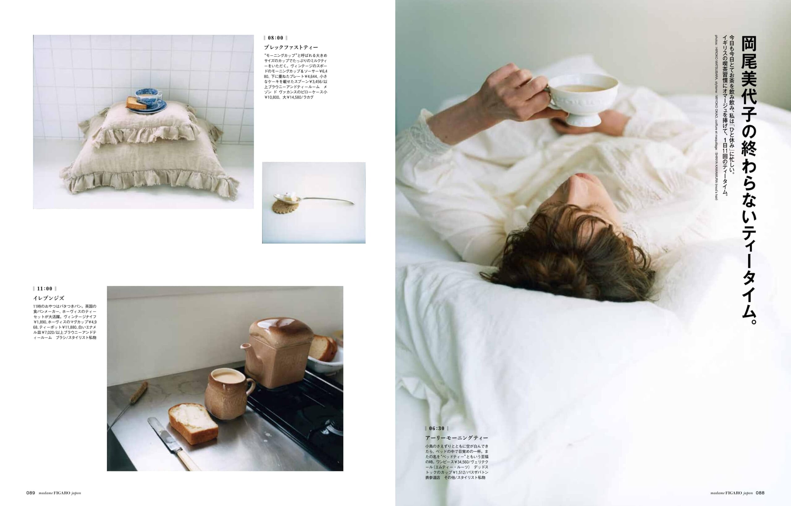 “1日11回のティータイム”をテーマに、朝のお茶、イレブンジズ、12時のお茶、アフタヌーンティー、夜 のお茶。スタイリスト岡尾美代子さんが紅茶の世界へ誘います。