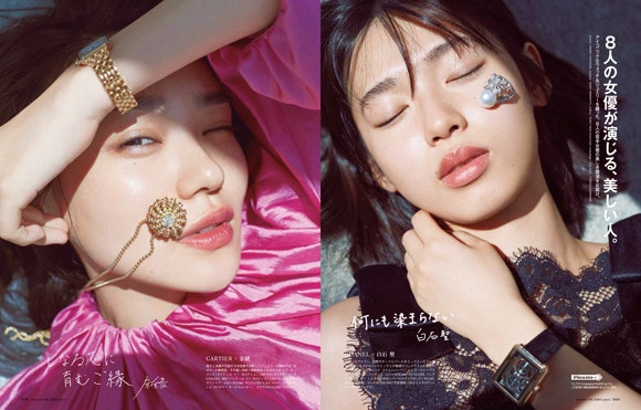 巻頭には、8人のフレッシュな女優がジュエリーと時計を纏って登場。シャネルのボーイフレンド スケルトンをつけた白石聖、朝の連ドラ『半分、青い』(NHK)に出演中の奈緒はカルティエのネックレスを。それぞれが描く“美しい人”の競演。