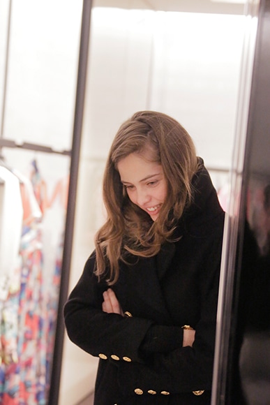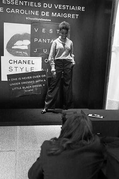 「このセッションは、シャネルを買う女性たちに会えるチャンスなのね。興味深かったのは、問題でもないことを問題だと思い込んでいるような女性がいて……。例えば、この服が好きだけど私には小さいので、とか、好きだけど私の年齢では、というようにね。私はそうしたことに解決策を見つけてあげられる。小さいスモーキング・タイプのジャケットが気に入っている女性には、ひとつ上のサイズを着ることを勧めたわ。そうすることで、ブレザーのように着ることができるの。ちょっとしたアイデアでスタイルを楽しむ提案、退屈じゃないスタイルを見つける提案をするの。とても楽しいわ。ベースにするのはエッセンシャルなアイテムよ」