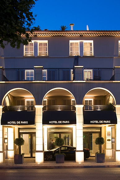 サントロペはパリからの交通の便が少しだけ悪い分、一般大衆に荒らされることなく相変わらず夢のリゾート地であり続けている。港からすぐの場所に、ホテル経営を夢見た夫妻が1931年にオープンしたHôtel de Paris(オテル・ドゥ・パリ)は、サントロペの変遷の証人。最初は2フロアと屋上のテラスからなるプチ・ホテルながら、クラーク・ゲーブルなどハリウッドのスターを迎える。1950年代、1フロアをプラスし、そして当時のフランスで珍しいことにいち早くクーラーを設置したことから、ホテルはさらに知名度をあげた。この時代、夏のオテル・ド・パリはパリのサンジェルマンをホームベースにする知的階級のたまり場と化し、ジュリエット・グレコ、ボリス・ヴィアン、ジャン・ポール・サルトルなどが集まるホテルとして、国際的に紹介されることになった。