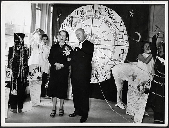 毎年11月25日、聖カトリーヌの日にどのクチュールメゾンのアトリエでも25才の独身女性たちが帽子をかぶってお祭りをする。写真は1950年頃のディオールのアトリエでのお祭り。この年のお祭りは、星座をテーマにしたようだ。photo:A. Fleury, DR