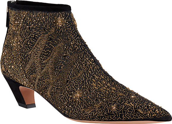 ゴールドの刺繍に彩られた4cmヒールのブーツ、紺色ベースに星座がワルツを踊るような90×90cmのシルクのスカーフなど魅力的。