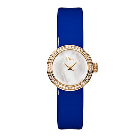 ディオール タイムピーシズの時計「La Mini D de Dior」は白蝶貝のフェイスにエナメルのブルーのブレスレットが映えて美しい。パフュームキャンドルは、マットなブルーにゴールドの星が輝いている。