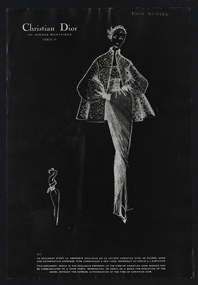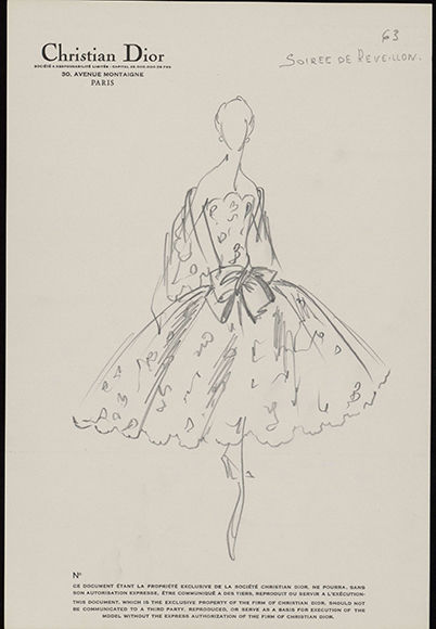 1949年秋冬クチュールコレクションの「北の星」や、1955年秋冬クチュールコレクションの「大晦日のパーティー」といったドレスのクロッキーなどがギャラリー・デ・ギャラリーで展示される。©Christian Dior