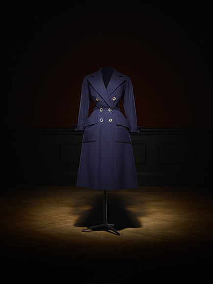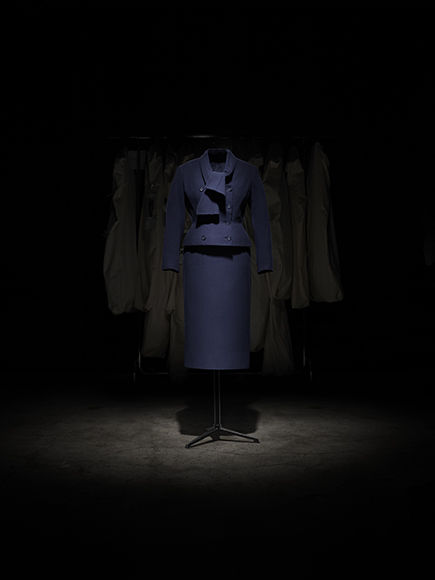 1947年のファーストコレクションの花冠ラインのコート「ドリス」、1954年春夏のスズラン・ラインのスーツ「ブールヴァール」などブルーのクチュールピースを展示。Collectiion Dior Héritage, Paris