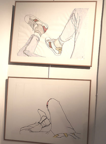ルーはいつもデッサン帳を持ち歩いいて、自分の視界内にある、例えば自分の靴、手、左腕、おへその下あたりから脚にかけて……などを描く。下絵をすることなく、観察力豊かに一気に描き上げていく。マグカップに描かれているのが左手ばかりなのは、そう、右手にペンを持って描いているからである。