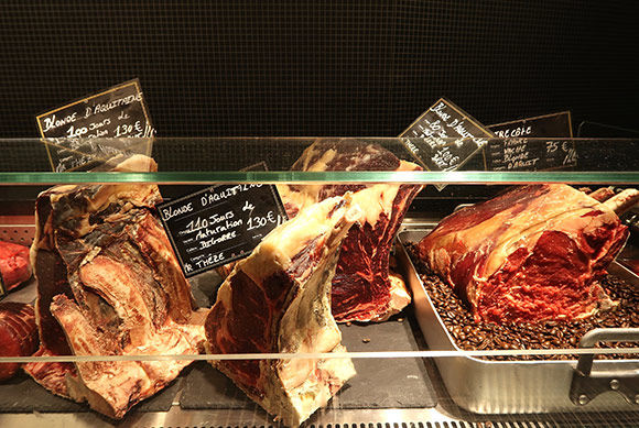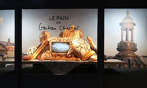 オスマン通りに面したウィンドウも、食一色に。大アップで肉、チーズ、パン……。