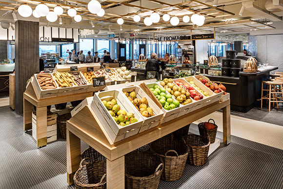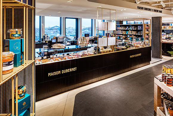 ヘルシー料理のLa Juicerie(ラ・ジュースリー)やカフェLomi(ロミ)などはテイクアウトできるだけでなく、窓に面したカウンター席に座って遠くにエッフェル塔を眺めながら、味わうことができる。フォアグラで有名なMaison Dubernet(メゾン・デュヴェルネ)はチキンハムやパストラミなどの創作を共にしているティエリー・マルクスとコラボレーションをして、ここでお惣菜も販売するだけでなく、初のレストランも。