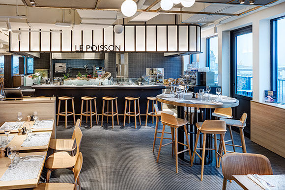 ブラッスリー的な真ん丸ランプが可愛い魚のレストラン。photo:Manuel Bougot