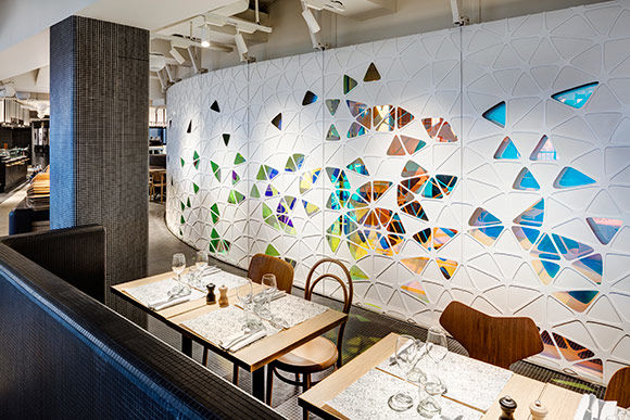ローラン・デュボワでイートイン。プランタン・デュ・グーを含むメンズ館の壁の装飾La Voile(ラ・ヴォワル)は、ヤブ・プッシェルバーグ建築事務所によるもの。花、モザイク、クーポールというプランタンの建築のアイコンがインスピレーションとなっている。革新していくエネルギーの象徴といった意味も含まれているそうだ。photo:Manuel Bougot