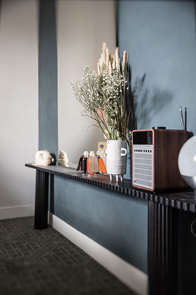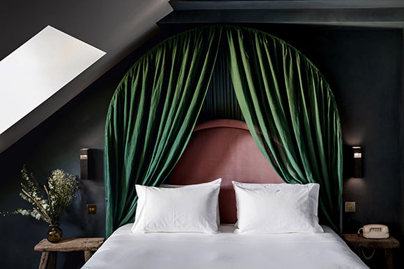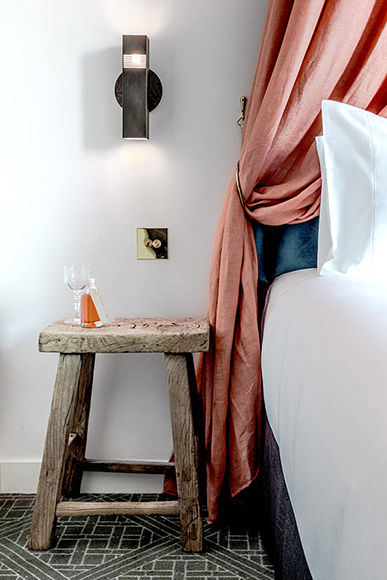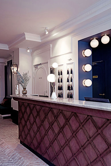 インテリアは人気の女性デザイナー、ドロテ・メリクゾンが担当した。彼女らしく、ホテルとなる場所の歴史を出発点にした内装である。当時の大通りはいまと異なり、緑あふれる散歩道で、この建物はフランス革命の少し前に建築された18世紀の個人邸宅だった。それでドロテはマリー・アントワネット、ルイ16世といった時代を思わせるドレープを寄せたカーテン、ガラス扉の戸棚、天蓋ベッドなどロマンティックな要素を室内に配し、それに古い木の家具や麻といった牧歌的味わいをミックスしている。これまで手がけたホテル同様に、バスルームには清潔さと機能性を重視。