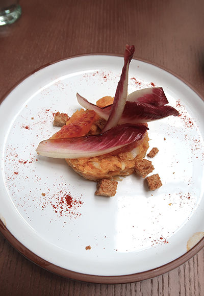 ある日のランチメニューより。ハドックのブランダード、さつまいも、クルトン、オレンジ、アンディーブの前菜。仔牛肉、ポロ葱のソテー、ロマネスコ・カリフラワーのメイン。