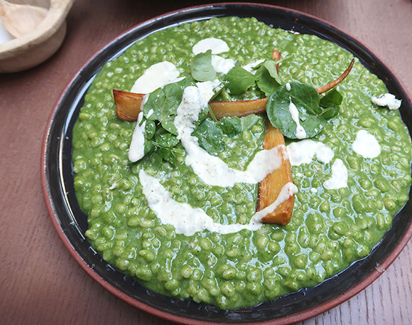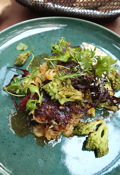 色も美しく、味も良い人気のメインはパネ人参をのせたクレソンの大麦リゾット。ブルーチーズが隠し味だ。