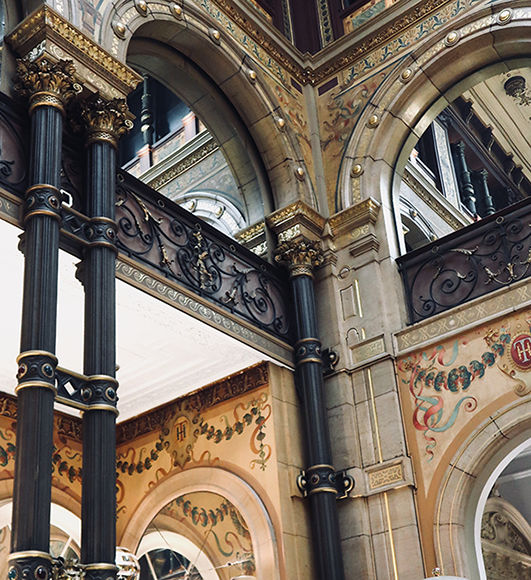 住所のサン・ラザール通り108番地のメインエントランスからホテルに入ると、少し上段の真正面にクラシックな空間が見える。ここは早朝から深夜まで営業しているグラン・サロンと呼ばれる広いスペースで、 素晴らしいのは歴史的建造物に指定されているゆえ、 建築ファンがため息をつく建築当時のままのゴージャスな建築と装飾が残されていることだ。