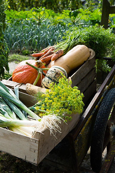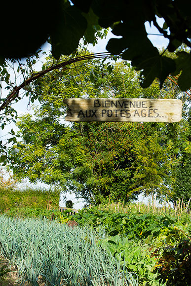 敷地内の野菜畑。ポタジェ(野菜畑)のもじりで、ポット・アジェ(年寄りの仲間たち)と命名されているのがご愛嬌だ。