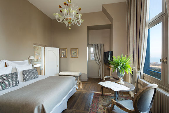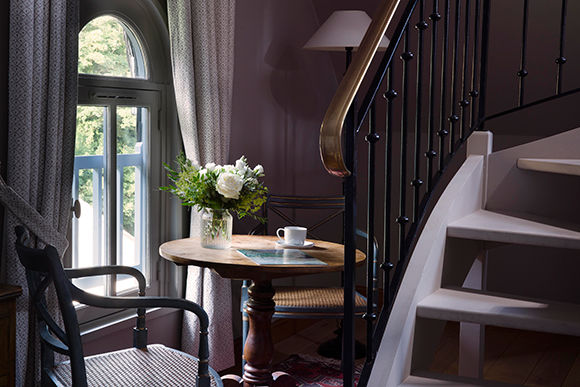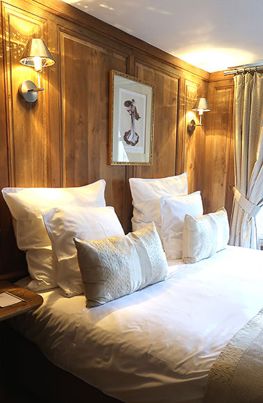 客室は本館、その延長の館、そしてスパのある建物に分かれ、合計34室。5つのカテゴリーがある。内装はオーナー夫人の手によるもので、フラマンの家具、ピエール・フレイやブサックといった老舗のカーテンが選ばれ、パリ人の別宅といった感じだ。どの部屋もゆったりとした作りで、部屋によっては海かと見間違う広がりを持つセーヌ川が窓から眺められる。印象派の画家たちを魅了したノルマンディの空の変化をベッドに横たわって目で追いかけるだけの、ぼーっとした時間もストレスゼロで悪くない。