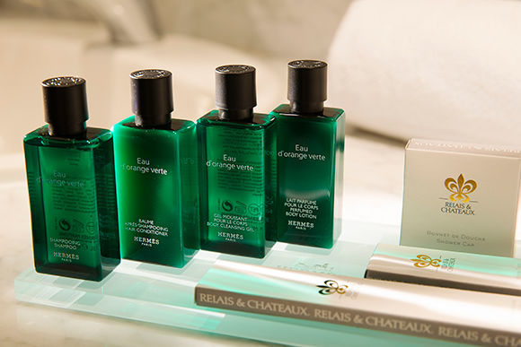 大理石のバスルームはとても清潔で機能的。アメニティはエルメスだ。