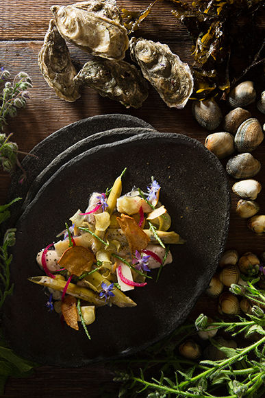 フェルム・サン・シメオンには、宿泊客以外にも開かれているレストランが2つ。ホテル内のガストロノミー・レストランは、現在活躍するフランス料理のシェフたちが師と仰ぐジャック・マキシマンが昨年からメニューをコラボレーション。80年代の大スターであるマキシマンの名の輝きは今も衰えず、彼の名前に引かれて食事にやってくる客も少なくないとか。南仏のレストランで海の幸を扱い慣れていた彼。今度はノルマンディの海の幸を相手に、料理をクリエイト!というわけだ。