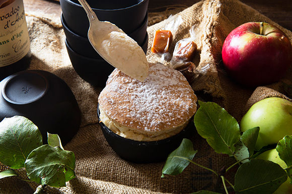 ノルマンディー地方の美味が大集合のデザートは、塩キャラメルバターのスフレ。カルヴァドスのシャーベットとりんごのコンフィが添えられる。