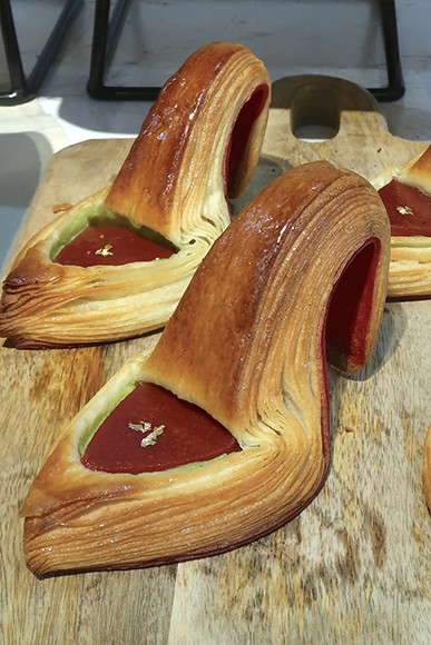 クロワッサン生地の甘いパン菓子。赤い靴底のフォルムのパンは、クリスチャン・ルブタンへのオマージュ!