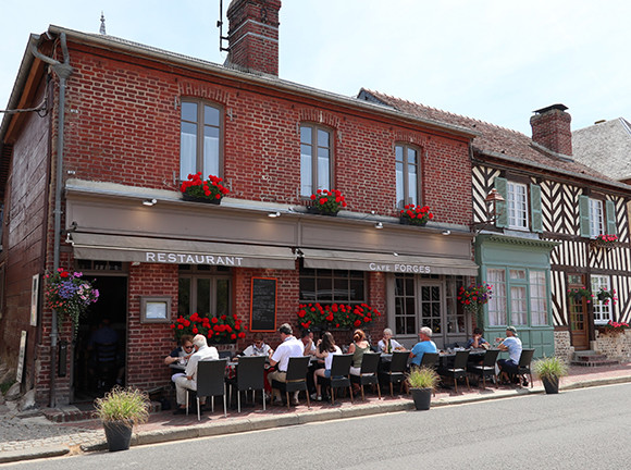 お腹が空いていたら、ビストロのCafé Forges(カフェ・フォルジュ)に入ってみよう。地元の素材を使っているものの、現代的味わいの料理。バターもクリームもこってりではないのがその秘訣だろう。オーナーは村の星付きレストランのPavé d’Auge(パヴェ・ドージュ)と同じジェローム・バンサールと聞くと、納得かも。内装には古びた木の柱や昔ながらのトメトと呼ばれる赤煉瓦の床などが残されている。ノルマンディー地方の小さな村にいる実感も味わいのうちだ。