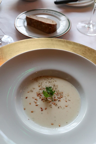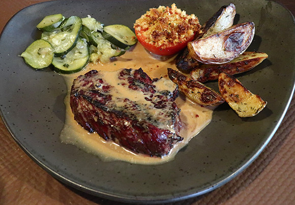 ノルマンディー地方らしくステーキのソースにもクリーム。前菜、メイン、デザートで20ユーロのセットメニューより。