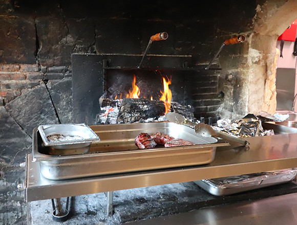 オープンキッチンで肉をグリル。店名のフォルジュは鍛冶屋という意味だ。
