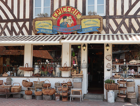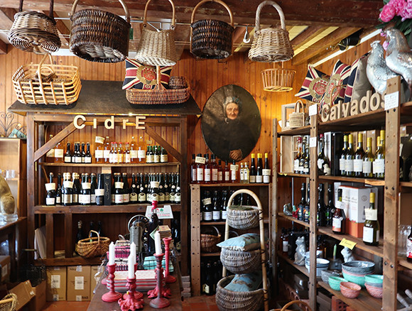 ビストロの隣には、とてもチャーミングな雑貨屋Epicerie de Beuveron en Auge(エピスリィ・ドゥ・ブーヴロン・アン・オージュ)がある。この村に来たら、素通りのできないブティックといったら、ここ。ノルマンディー地方の木組み建築のブティックの前にはこれでもかというほどバスケットが並べられ、その光景につい引き寄せられる。店内には地方の名産が揃えられていて、お土産探しにはまってしまいそう。