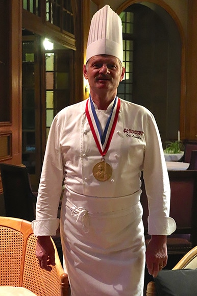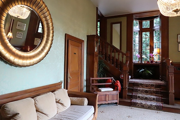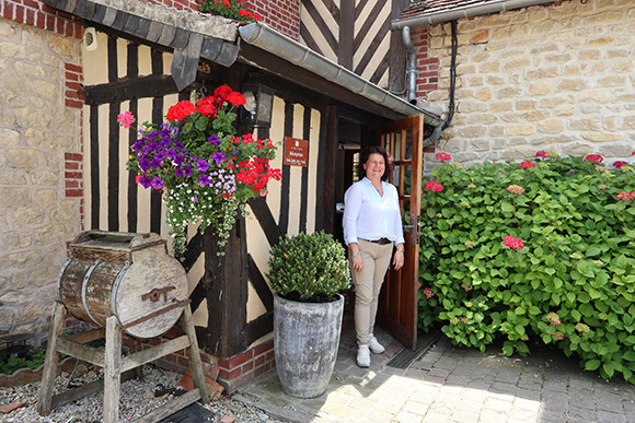 ゲストを迎えるオーナー夫人。入り口の左手には昔のバター製造器が置かれ、ノルマンディーらしさを演出している。
