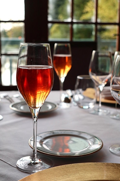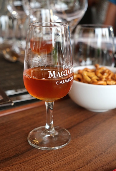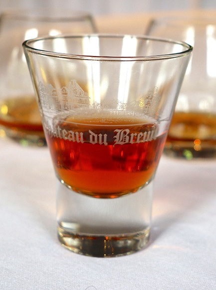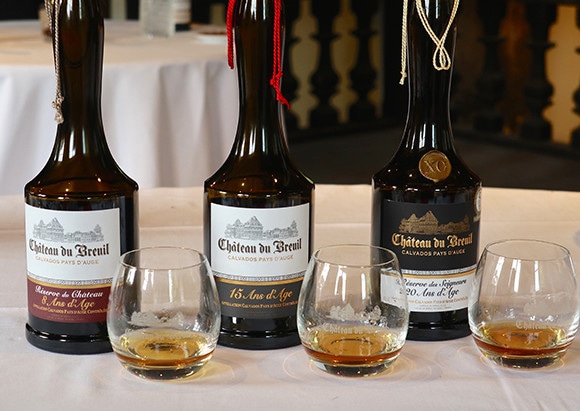 カルヴァドスは一般的に飲まれているのはいちばん若い2年もの。シャトーではグループを対象に8年、15年、20年のカルヴァドスの試飲会も有料で開催している。ゴールデンイエロー、アンバー……と年数とともに色が深みを増してゆく。