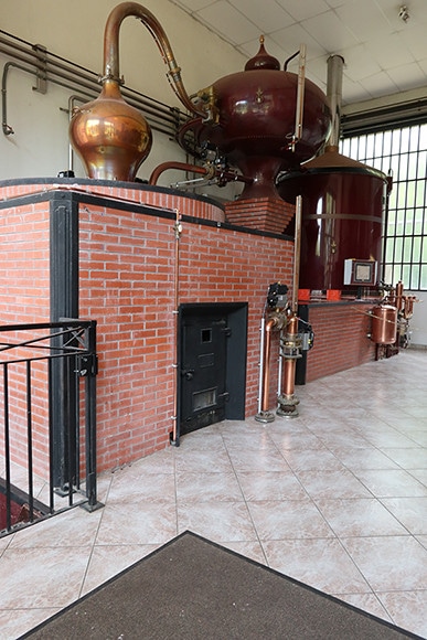 銅製の蒸留機を備えたアトリエ。カルヴァドス作りには2回の蒸留が必要で、それによって得られた70~72度のアルコールがオーク材の樽に移される。なおシャトー・デュ・ブルイユのカルヴァドスはAOCペイ・ドージュ産のりんごを使い、シードルには5パーセントの洋梨を使用しているそうだ。