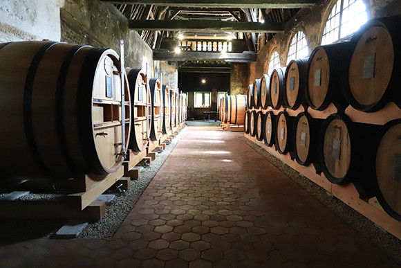 貯蔵庫内。このシャトーでは外から買い入れたりんごも含め、毎年3,000トンのりんごから82万本のカルヴァドスを生産している。70~72度あったアルコールがここで貯蔵されて41度となりボトルに詰められるのだ。