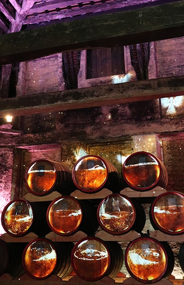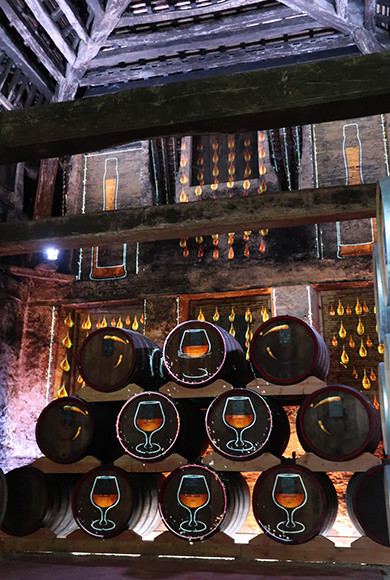 貯蔵庫見学の最後は、りんごからはじまるカルヴァドスの製造過程を見せるプロジェクション・マッピングだ。寝かせている間に蒸発する分が「天使の分け前」と呼ばれていることから、天使が昇ってゆく姿も……。