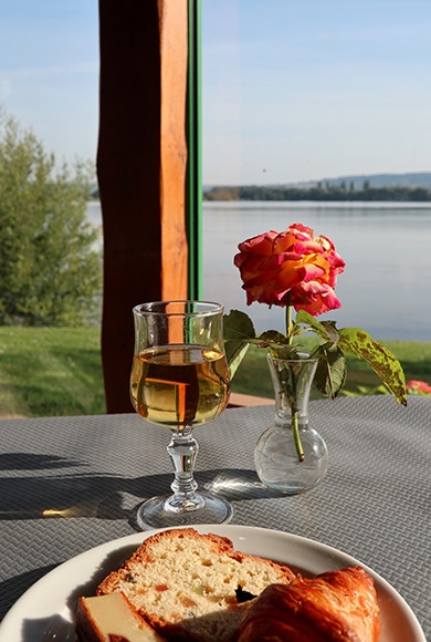 朝、湖を眺めながらノルマンディーのりんごジュースを。