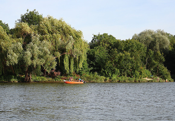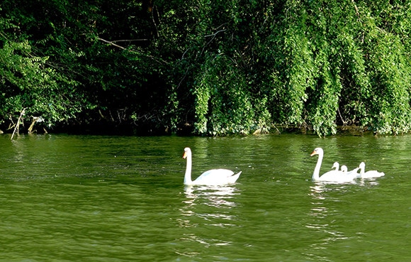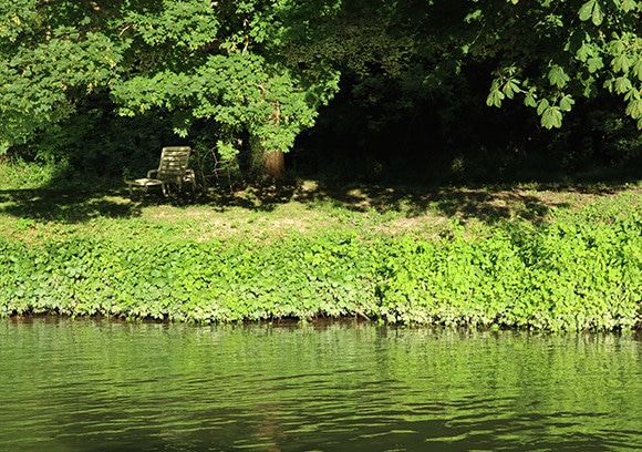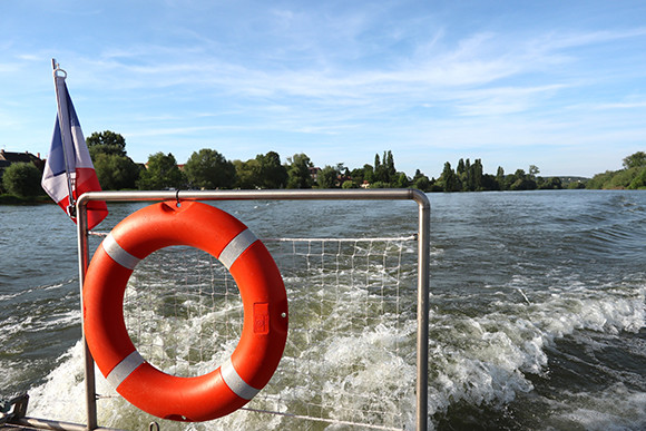 時速12キロでのんびりとセーヌの水上を進むクルーザー。周囲は緑、緑……そんな中を船が前進すると、ぽつんと釣り人の姿、船着き場の奥に家があり、そのテラスでブランチをとる島の住民、水車小屋、昔ながらの藁葺き屋根の家、第二次大戦中にドイツ軍の侵略を防ぐためにフランス軍が橋を落とした名残などが現れては消えてゆく。船が残す波は水に映る周囲の緑を優しく揺らす。そんな光景にも心和ませられる。シードルやチーズなどノルマンディー名産をあれこれ買い込んで乗船すれば、途中、船上ピクニックというお楽しみも。