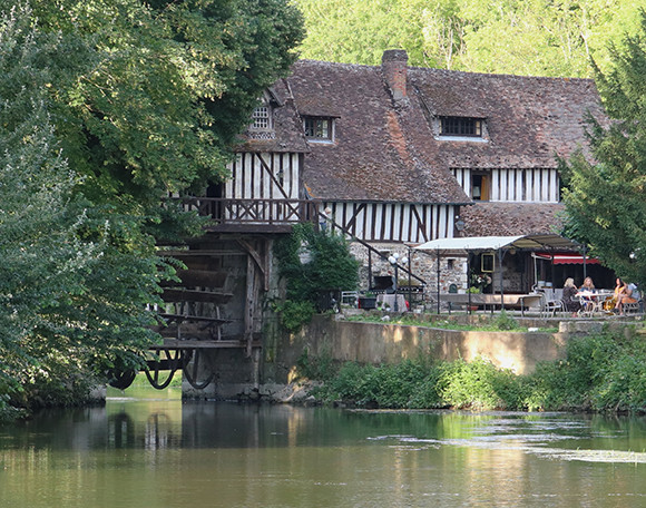 セーヌ川に浮かぶ小島に建つLe Moulin de Connelles(ル・ムーラン・ドゥ・コネル)は、船着き場のある4つ星ホテルだ。クルーザーの旅を満喫したら、そのままチェックインできる。19世紀のアングロノルマン・スタイルの邸宅だった建物で、内装はとてもクラシック。川にまたがる橋のような感じにレストランがあるので、食事をしながらガラス窓越しにセーヌが眺められ、ロマンティックな時間が約束されている。このホテルのレストランはミシュランもお勧め。今春からの新しいシェフ、エリック・ルジャンドルは地元の食材を取り入れたクリエイティブで味わい深い伝統的な料理を提案する。パリから車を走らせて食事に来る客がいるというのも頷ける繊細な美味しさだ。このホテルで食事をするのなら、シードル、ポモー、黒カシスのオリジナルのアペリティフでスタートしよう。美味しいノルマンディーを発見する食事の素晴らしい幕開けとなるはず。天候に恵まれたら庭で食事をとることもできる。