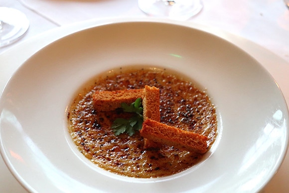 フォアグラのクレーム・ブリュレ。上にのせたパン・デピスのかりかりとした食感がフォアグラと、とても良いハーモニー。