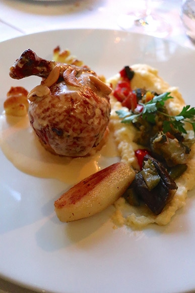 ほろほろ鳥。カマンベール、シードル、生クリームのソースが軽い。カラメリゼしたりんご、クリーミーなポレンタを添えて。