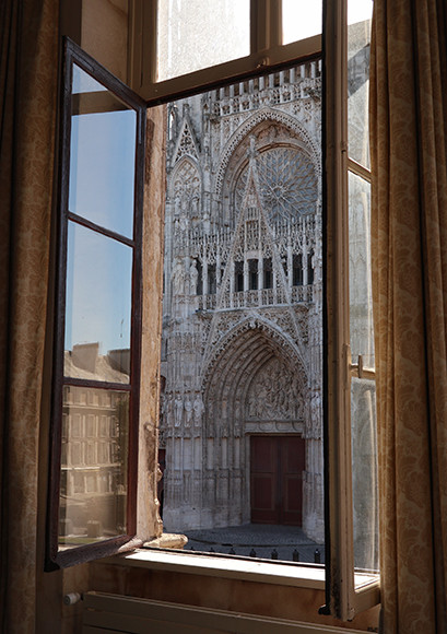 なぜジヴェルニー経由でルーアンに行くのがいいかというと、この地の観光名所のひとつに、クロード・モネが連作を描いた壮麗な大聖堂を見学できるという“モネ”つながりがあるからだ。彼が大聖堂の正面の建物にアトリエを構え、そのファサードを描き続けたのは1892年と1893年の2月から4月にかけて。イーゼルを複数並べて、1日の移ろう光に照らされるゴシック建築の大聖堂に対峙した彼。「描くほどに描きたいものから遠ざかる」と語っている。残された作品は30点近く。パリのオルセー美術館、日本のポーラ美術館など世界中に散逸し、ルーアン美術館には『曇りの日、朝9時』の1点が残るのみである。時間があれば、美術館でその貴重な1点を鑑賞しよう。モネがアトリエを構えた大聖堂の正面の建物には現在ルーアン観光局が入っている。アトリエのあったフロアは一般公開されていないのだが、観光局主催のツアーに参加すると見学できるそうだ。