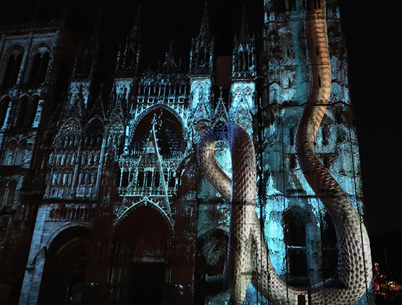 この大聖堂。6月15日以来、陽が沈むと観光客だけでなく地元民もその前の広場に集まってくる。彼らのお目当ては、レース細工のような石の彫刻で飾られた大聖堂のファサード上で展開されるプロジェクションマッピングだ。テーマはふたつで、9世紀にノルマンディー地方を侵略した北欧のバイキングたちの物語『バイキング』とギヨーム征服王の数々の偉業をたどる『ギヨーム征服王』の合計50分。尖塔のてっぺんまでが150メートルあり、フランスで一番、世界で二番目の高さを誇るという大聖堂のファサードを余すとこなく使って繰り広げられる壮大なロマンとサウンドが、広場を満たす人々を驚嘆させる。歴史ファンでなくてもおおいに楽しめる仕上がりで人気を呼んでいるようだ。