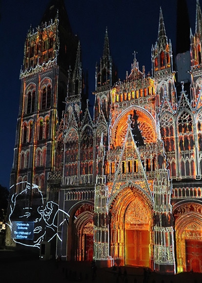 大聖堂のプロジェクションマッピング。合計50分で2本が見られる。8月16日~31日は22時まで。9月1日~22日は21時30分まで。なおノルマンディー地方の人を“normand(ノルマン)”と呼ぶが、911年のノルマンディー公国建国当時、“ノルマン”というのは北の人、つまり北欧から侵略してきたヴァイキングをさす言葉だった。