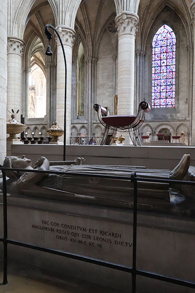 大聖堂は外観ばかりではなく内側も観光スポット。ステンドグラスには中世の聖人ジュリアンが描かれていて、この地に生まれた作家ギュスターヴ・フローベールに小説のインスピレーションを与えた。ステンドグラスはとても見事。物語は下から上、左から右へと流れているのだが、ちょっと面白いのは最下段には関係のない魚の絵柄が見られることだ。それはなぜか。このステンドグラスの制作費用を出資したのが漁業組合だったということで、この時代なりの宣伝方法だったとか。この大聖堂には世界史の授業で聞き覚えのあるリチャード獅子心王の心臓が葬られている。十字軍に参加した勇敢なイギリス王であるが、ルーアンを愛した彼は遺言でそのように希望したからだそうだ。