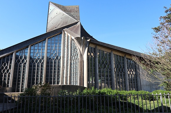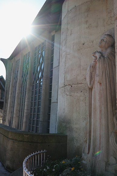ルーアンという地名に、すぐさまジャンヌ・ダルクを思う人もいるのではないだろうか? 街を歩いていて見かけるかもしれない、1431という年号。ジャンヌ・ダルクが異端とみなされてイギリス軍により処刑された年だ。25年後の裁判で、彼女は無罪となり名誉を回復し、救国の存在となる。処刑された広場はその後屋内市場となっていたが、1979年に聖ジャンヌ・ダルク教会が建築された。設計したのはルイ・アレシュで外から見ると上に立ち上るような屋根のフォルムが印象的で、 内部には造船技術が用いられ、船を逆さにしたような作りとなっている。