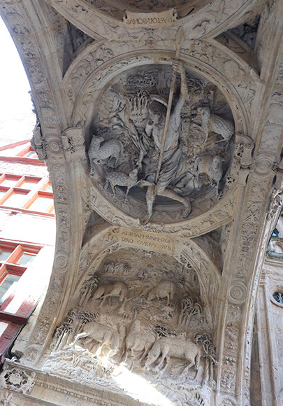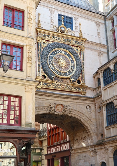 大聖堂に次いで人気の観光スポットは一本針の大時計。ルーアン市内もパリと同じようにセーヌ川によって右岸と左岸に分かれているが、国鉄駅および観光スポットはすべて右岸に集中していて、大聖堂と大時計もすぐ近くという距離にある。大時計は改装されて16世紀のものだというが、中のメカは1389年のもので、しかもそれがいまも機能している事にびっくり。駅前広場からのびるジャンヌ・ダルク通りと大時計通りが交差するところのアーチで、14世紀から時を刻み続けている。アーチの下を通るときには、上を見上げてみよう。キリストがたくさんの羊たちとともに彫り込まれている。ちょっと珍しい図柄。羊はルーアンのシンボルである。