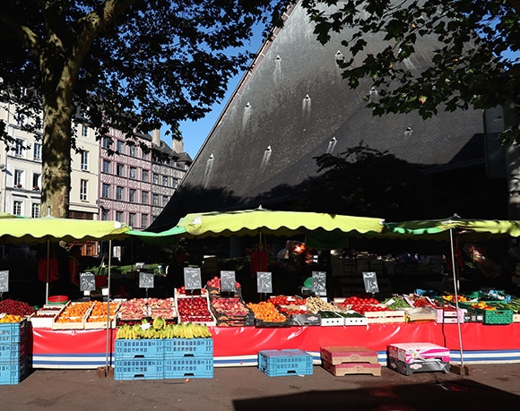 市場では魚、肉、野菜……食事に必要な素材が何でも揃っている。活気いっぱいの魚屋さんの裏手にはスタンド式のイートインコーナーがあるので、フレッシュなカキをはじめ、地元民に混じって海の幸を味わってみれば? ルーアンというのは海から車で45分の距離にある。たとえばカキはモンサンミッシェルやブルターニュから届くそうだ。市内のレストランでは新鮮な素材が入手しやすいので、シーフードメニューも自慢にするシェフも少なくない。肉は鶏、七面鳥、鴨がルーアンでは多く食される。名物料理に鴨のルーアン風というのがあり、これは二段階加熱と独特のまったりしたソースというのが特徴の料理。ルーアン市内でこの料理を出す店として名高いのは、市場近くにある創業1345年の旅籠レストランのLa Couronne(ラ・クーロンヌ)だ。