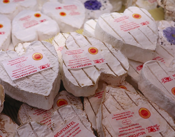 チーズのヌーシャテルはハート型なので探すのが簡単。リヴァロ、ポン・レヴェックなどのノルマンディー地方のチーズが市場では簡単に入手できる。