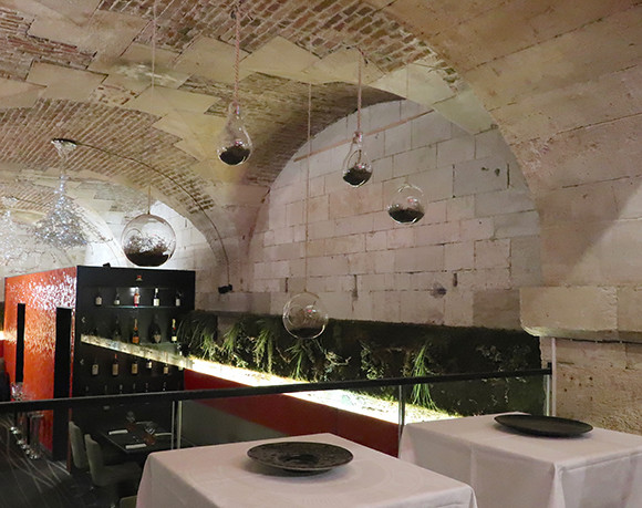 観光客相手な場所ではなく、いま風な食事をルーアンで、というのなら、18世紀の石造りの地下倉庫だった場所にできたレストラン6eme Sens(シージエム・サンス)を試してみよう。市場からも遠くない。ここはノルマンディー地方の食材を有効に用いた創作料理を出すことを使命にしている店。でも、もちろんポモーもシードルも味わえます!!