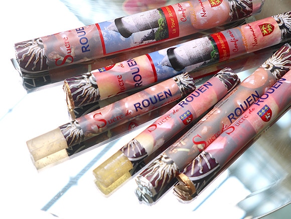 手頃なお土産に何か名産は? たとえば、りんご飴(sucre de pomme)がある。これはフランスの駄菓子屋さんでよく見かけるキャンディーのように棒状で、大麦糖の代わりにりんごの糖分を使ったもの。ほんのりとりんごが香る、透明なキャンディーは優しい味で疲れたときにちょっと口にしたくなる。観光局の1階にはお土産品ブティックがあり、そこではルーアン市が組織するハンディキャップを持った人々のアトリエで製造されるりんご飴を販売している。チェリーを使ったチェリー飴(sucre de cerise)も。りんご飴が透明な黄色なら、こちらはほんのり桜色だ。