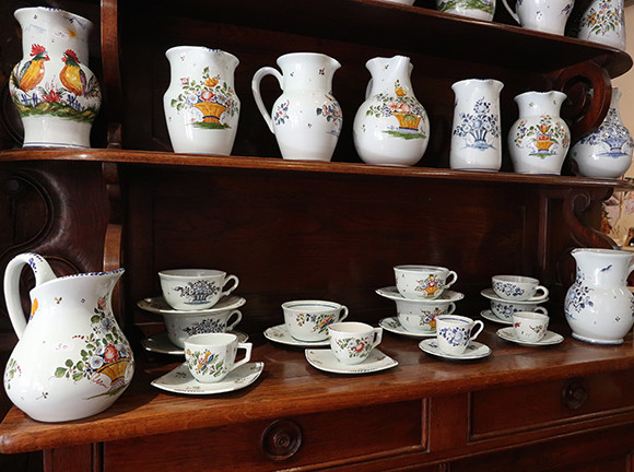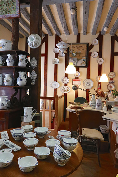 ルーアン焼きの可愛いブティックFaïencerie Augy(ファイアンスリィ・オジィ)の前を偶然通ることがあったら、中に入ってみよう。時間によっては、店内で陶器に手描きする職人の作業が眺められる。皿、カップ、タイルなどアイテムもいろいろ。昔から伝わるルーアン焼きの技術そのままの作業で、新しくなったのは釜が薪ではなく電気になったことだけ、とか。